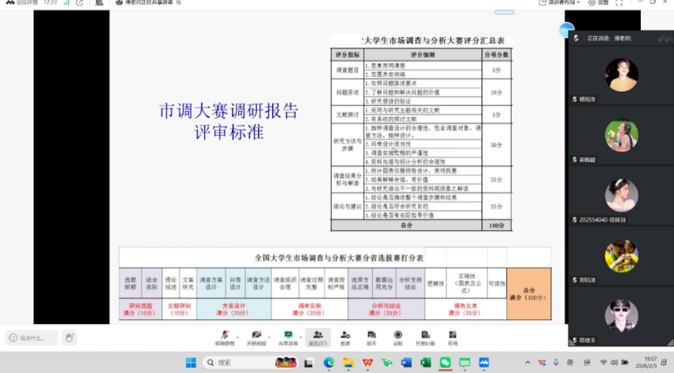 针对市场调研全流程,傅老师系统梳理了从前期需求分析、问卷科学设计,到数据精准采集、专业分析,再到报告规范撰写、成果高效展示的关键环节,帮助研究生建立起 “全链条” 调研思维。同时,他还结合大赛评分细则,通过可视化呈现评分指标,让学生直观掌握得分关键。“这些评分标准不仅是竞赛的‘评分尺’,更是我们开展市场调研的‘规范手册’。” 傅老师的讲解让在场研究生对专业实践的规范性有了更深刻的认识。