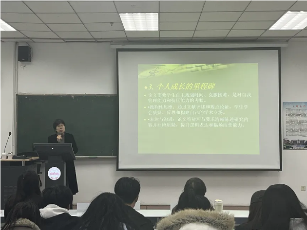培训会上,刘晓溪副教授首先以“从合格到优秀-论文撰写的质量保证”为题,结合往届学生论文的具体案例,深入剖析了论文中常见的“不合格”硬伤与“优秀”亮点,聚焦于撰写规范与细节把控,为学生提供了极具操作性的质量提升策略。